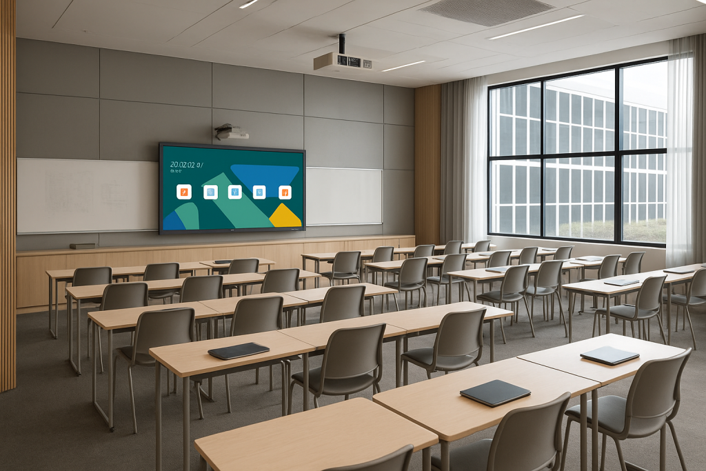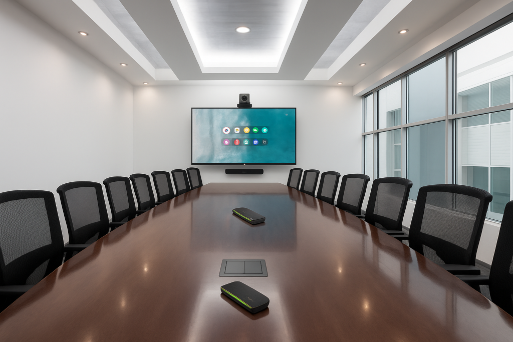 • Producto clave: Pantalla(s) QMaster + barra de videoconferencia top (Logitech Rally plus) + micrófonos de techo o superficie + integración de sala (iluminación, control, etc.)