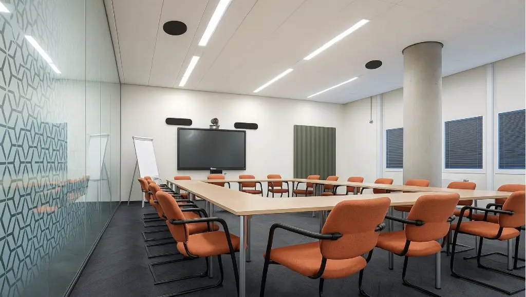 Diseñada para juntas directivas y salas donde la imagen importa. Combina pantallas QMaster de gran formato, cámaras de alta precisión, micrófonos de techo y control unificado para ofrecer una experiencia profesional